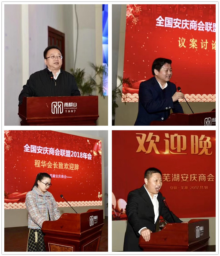 2017年11月18日,全國安慶商會(huì)聯(lián)盟2018年會(huì)在蕪湖雨耕山內(nèi)思禮堂隆重召開。來自全國各地18家異地安慶商會(huì)的會(huì)長、秘書長及宜、蕪兩地領(lǐng)導(dǎo)及宜籍企業(yè)家們歡聚一堂,共商安慶商會(huì)聯(lián)盟大計(jì)。會(huì)議由安慶市工商聯(lián)主席王曉輝主持。蕪湖市委常委、宣傳部長段玉嘉,蕪湖市委統(tǒng)戰(zhàn)部副部長、市工商聯(lián)黨組書記馮建,安慶市委常委、市政府副市長蒲彥君出席會(huì)議并作了重要講話。